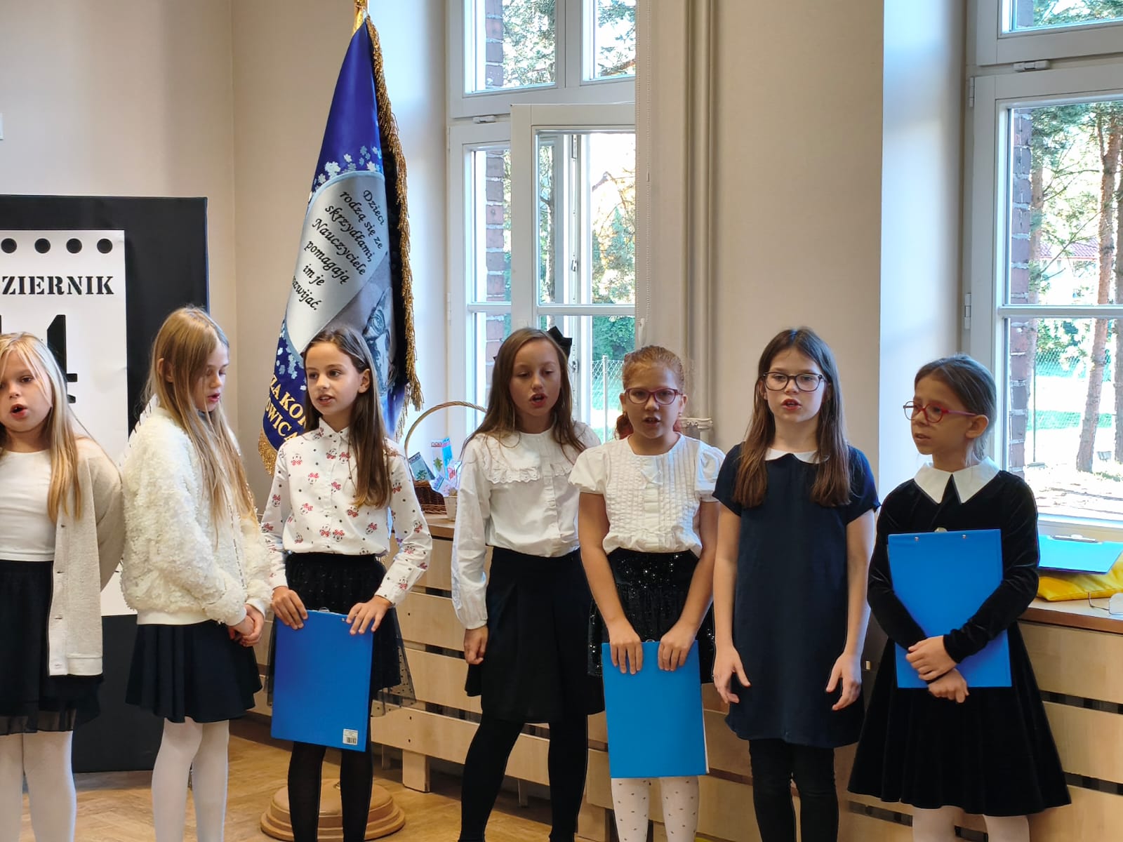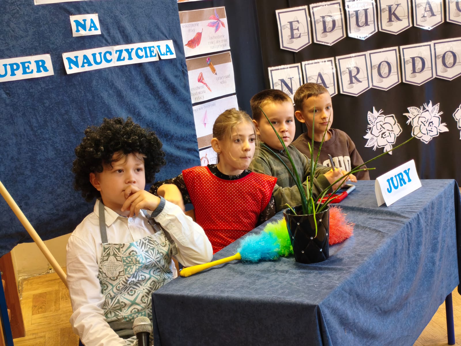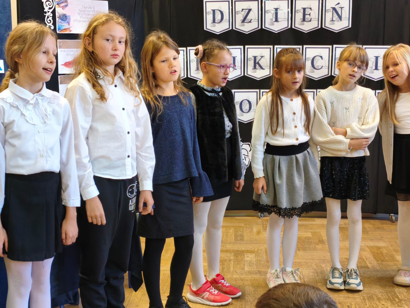 Pierwszoklasiści urzekli publiczność uroczymi wierszykami, które wyrecytowali z pamięci. Ich życzenia skierowane były do wszystkich pracowników szkoły — od nauczycieli, woźne, przez konserwatorów po sekretarkę. Było to pełne ciepła i wdzięczności podziękowanie za codzienny trud i zaangażowanie.