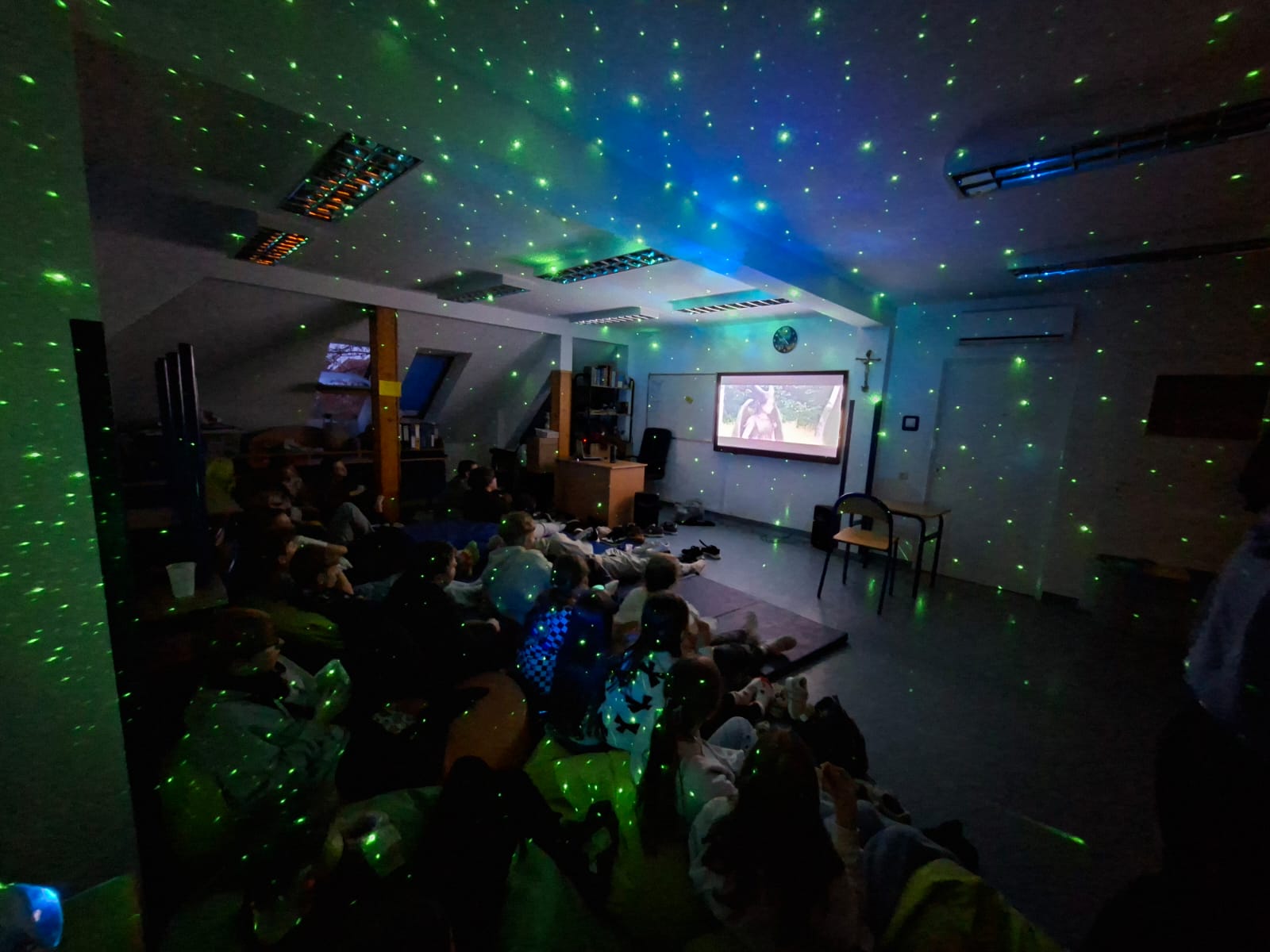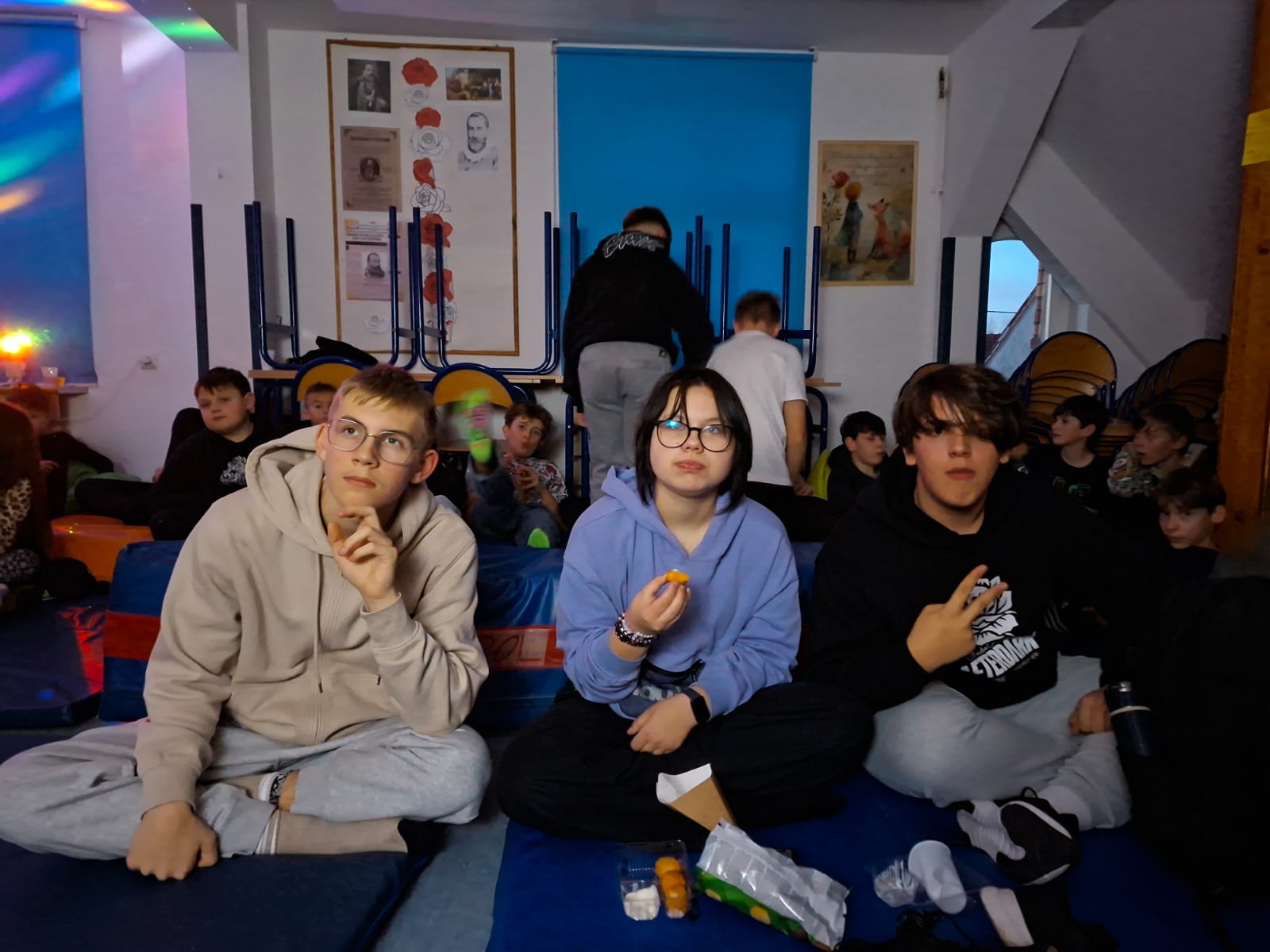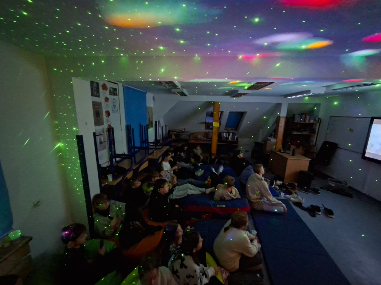 W dniu wczorajszym odbył się w naszej szkole wieczór filmowy, który cieszył się dużym zainteresowaniem uczniów. Sala została specjalnie przygotowana – wyłożono ją materacami, a na suficie rozbłysła kolorowa kula, tworząc wyjątkową atmosferę sprzyjającą wspólnemu oglądaniu filmów.